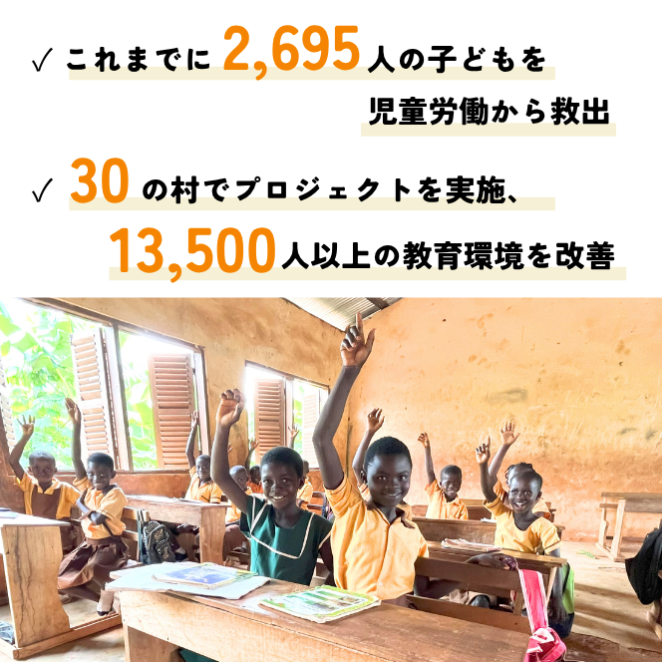 また、児童労働をなくすための制度づくりにも取り組んでおり、ガーナ政府と協働して「児童労働フリーゾーン(CLFZ)」制度の整備を支援しています。
