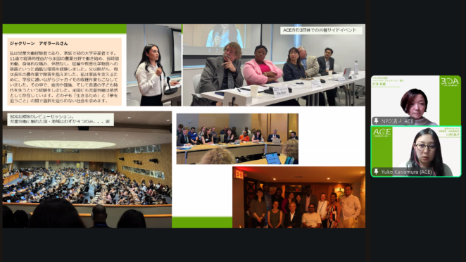 7月にニューヨークの国連本部で開催された国連ハイレベル政治フォーラムに参加した私から、メインセッションへの参加のほか、ACEが主催したサイドイベントの様子や、他団体主催のサイドイベントへ登壇し、イベントテーマに合わせながらACEの活動を共有したことなどを報告しました。