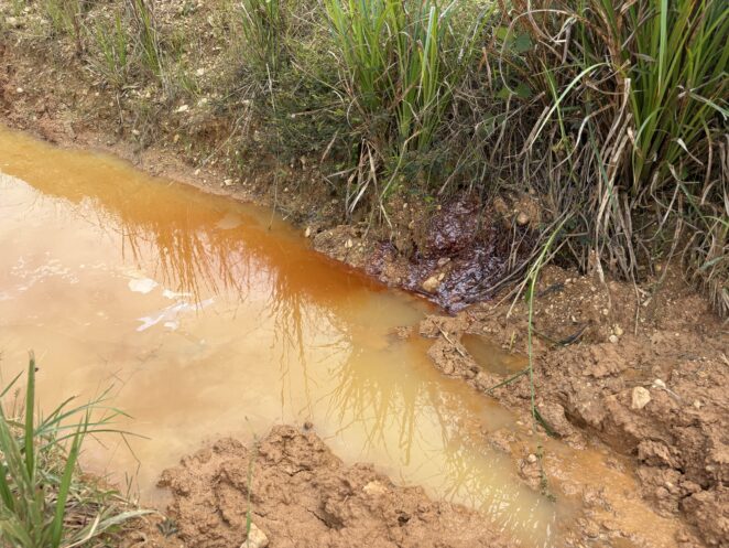 ガラムセイサイトに流れる水は、採掘に伴う土壌の流出および水銀などの化学物質によって赤く変色しています