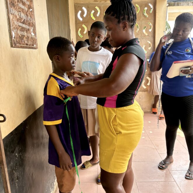 プロジェクトでは、子どもたちの就学支援として学用品と制服を支給します。制服を作るため、1人ずつ採寸を行いました。緊張しながらも少し誇らしげな子どもたちの表情が印象的でした。