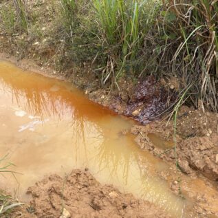 金の採掘が終わった後の土地は、深い穴が掘られたまま放置され、水が溜まり、荒れ果てた状態になります。採掘に伴って流出した土や水銀などの化学物質により、水は赤く濁り、環境や人々の健康への影響も懸念されています。