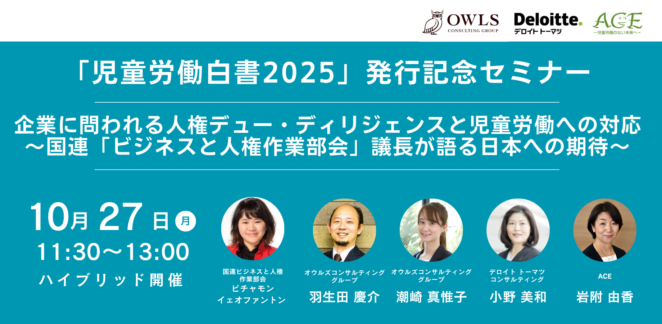 ACEは、株式会社オウルズコンサルティンググループとデロイト トーマツ コンサルティング合同会社とともに、児童労働に関する最新状況や企業に求められる対応などを包括的にまとめた「児童労働白書2025 ―ビジネスと児童労働―」を今秋、5年ぶりに発行します。 その発行記念セミナーとして、国連ビジネスと人権作業部会議長のピチャモン・イェオファントン氏を迎え、世界の「ビジネスと人権」の潮流や日本の課題、企業への期待について聞くとともに、各領域でビジネスと人権に取り組む専門家のパネルディスカッションを行います。 「ビジネスと人権」に関する国内外の多様なルール・法令の策定等を背景に、この数年間で人権デュー・ディリジェンスに取り組む日本企業は増加しています。児童労働は、企業が留意すべき特に深刻度の高い「人権リスク」のひとつであり、自社のサプライチェーンにおける児童労働のリスクを把握し取り組むことは、「人権を尊重する経営」の実践に欠かせません。直近の世界の情勢を踏まえ、「ビジネスと人権」について、日本そして日本企業が求められる対応についてご関心のある方はぜひご参加ください。 開催概要