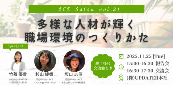 ACEでは、児童労働に関する課題解決に向けて、2008年頃から企業との連携を進めています。2016年にはACE法人会員制度を設け、課題の重要性を理解し、活動趣旨に賛同いただける法人様に会員としてACEの活動をご支援いただいています。 そして法人会員の皆さまと共に学び交流する場として2017年より継続して開催しているのがACE交流サロンです。本サロンでは様々なテーマでともに学びを深めるとともに、ご参加いただく企業の皆さま同士の交流や連携創出の場としてもご活用いただいております。 第21回となる今回は、多くの企業・団体が経営上の課題の上位に挙げる「人材」に焦点を当て、「多様な人材が輝く職場環境のつくりかた」を考えます。 最新の中小企業白書によると、中小企業が最も重視する経営課題の調査では「人材確保」と回答する割合が最も高く、人材不足への対応は規模や業種に関わらず最重要事項となっています。また採用後の早期離職も課題として挙げられており、人材が定着する職場づくりも重要なテーマです。 そんな多くの企業・団体が直面している「職場づくり」にハード面でのサービスを提供している株式会社UPDATER様とともに、制度やコミュニケーション等ソフト面での取り組みを行うACEより事例紹介をさせていただきます。 限られた時間になりますが、ぜひ皆さまにフィットする課題解決のヒントを見つけにお越しください! UPDATER みんなワークスの概要みんなワークスは、株式会社UPDATERが提供する従業員ウェルビーイング向上のためのプラットフォームです。 ACE 日常でのコミュニケーションと人事評価制度の概要ACEでは、コロナ禍以降、完全リモートワークへ移行し、現在はオフィスを持たず、スタッフは自宅から業務を行っています。 リモート環境でもつながりを育むため、NVC(非暴力コミュニケーション)や対面合宿などを活用し、他者理解の機会を重ねています。 また、フルリモート移行後に入職したスタッフが半数を占める中でも、定着と活躍を支える仕組みが機能しています。 組織運営にはホラクラシー®を導入し、役割ベースで運営を行い、人事評価には自己決定の考え方を取り入れ、貢献や自己評価が報酬に連動する仕組みを進めています。 今回のサロンでは、人が定着し、活躍できる職場づくりのヒントとして、ACEの実践をご紹介します。 プログラム(予定)15:00 開会・開催趣旨ご案内 開催概要