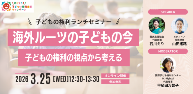 ACEが事務局を務める広げよう!子どもの権利条約キャンペーン主催のイベントが開催されます。 いわゆる「外国人」と言われている人って誰のこと?海外ルーツの子どもたちは、日本でどんな暮らしをしているの?どんな問題に直面しているの? 日本でくらす海外ルーツの子どもたちの中には、言葉の壁等によって学校で学びの権利が十分保障されていなかったり、学校や地域でのいじめ、差別や偏見によるへイトスピーチなどに苦しむ子どもたちがいます。 また、非正規滞在者を減らし強制送還人数を2030年までに倍増させようとしている「ゼロプラン」(2025年5月策定)によって、強制送還が強化される中、親とともに子どもも帰らざるを得ない、日本での学びをあきらめざるを得ないなど深刻な問題も起きています。 今回は、日本に逃れてきた難民の法的支援・生活支援・定住支援・政策提言などに取り組んでいる難民支援協会の石川えりさん、言葉の壁や差別的言動によって不安を抱える海外ルーツの子どもたちに日本語とつながりを届ける活動をしているメタノイアの山田拓路さんからお話をしていただき、子どもの権利の視点から、課題を捉え、どのような取り組みが必要なのか、私たち一人ひとりができることを考えます。 開催概要日 時:2026年3月25日(水)12:30-13:30(入室開始 12:25~) プログラム(予定) お申込みはこちら:https://crcc-20260325.peatix.com/ |